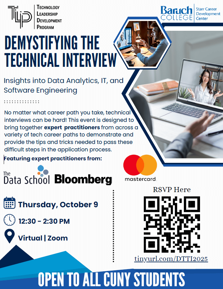 I'm excited to invite you, your students, & faculty once again to the 3rd annual, Demystifying the Technical Interview: Insights into Data Analytics, IT, & Software Engineering virtual event Thursday 10/9 @ 12:30pm! [FLYER ATTACHED] This event, launched in 2023, is now a staple for the Technology Leadership Development Program (TLDP) @ Baruch.