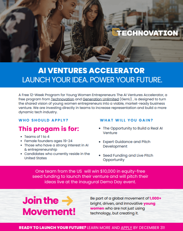 The AI Ventures Accelerator is a completely free, 12-week program (January-March 2026) that helps teams of young women ages 19-24 turn their ideas into investor-ready AI ventures. The top 10 teams will win $10,000 in equity-free seed funding.