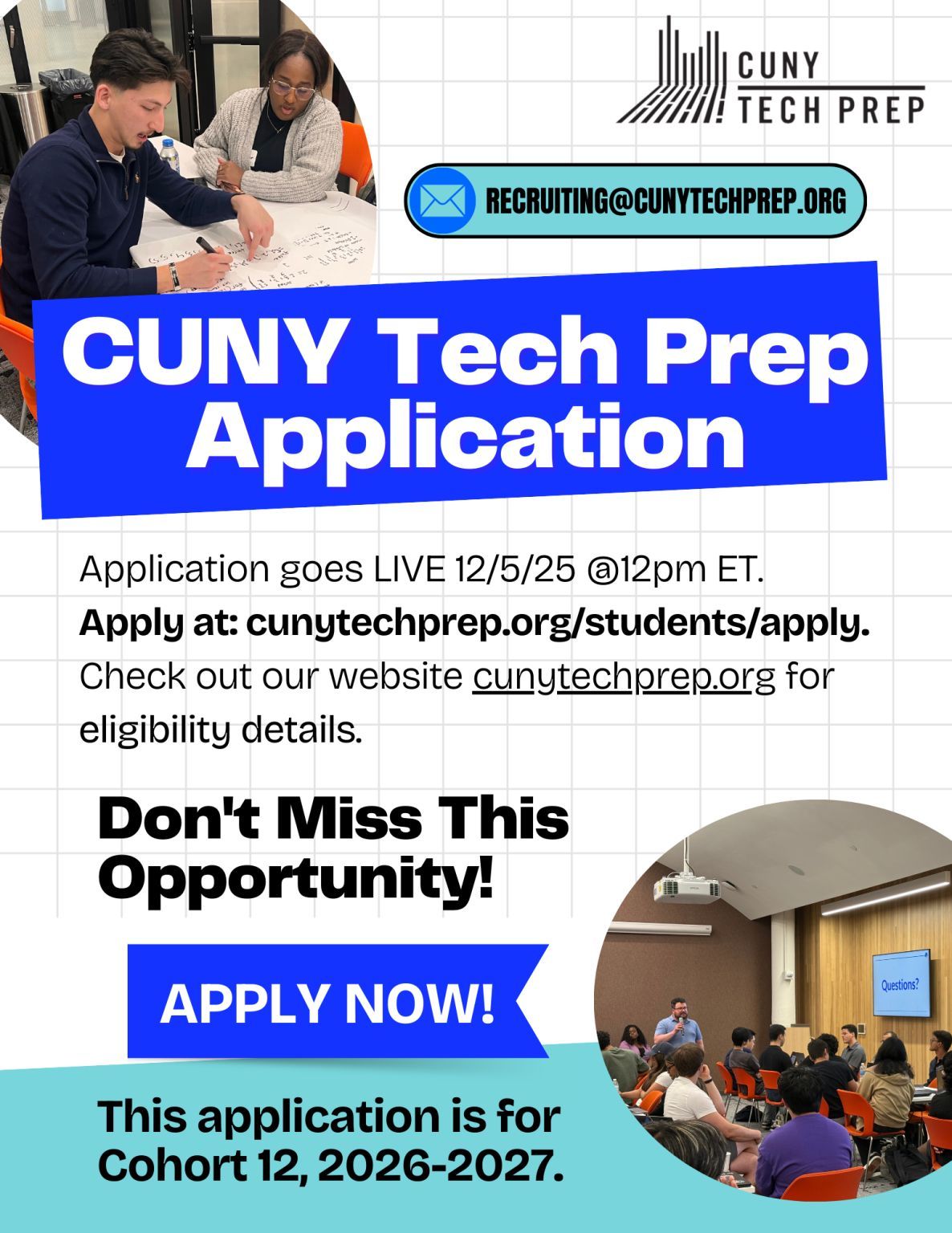 CUNY Tech Prep is a yearlong technical and professional development program for CUNY computer science and related majors to learn in-demand technologies, master professional soft skills, and land great tech jobs in NYC.