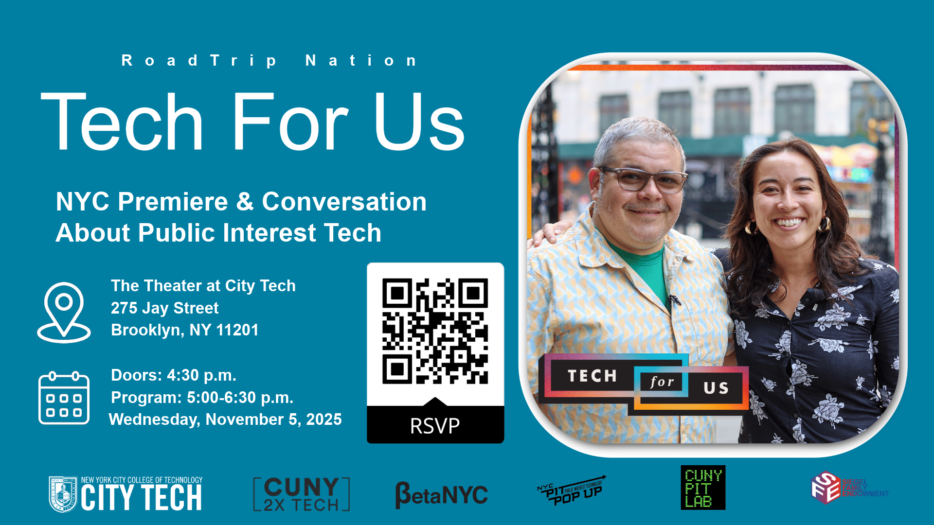Roadtrip Nation’s new documentary series “Tech for Us.” Following the journey of three young adults as they explore possibilities in public interest technology, this screening will set the stage for a dynamic panel discussion featuring voices from across New York City’s public interest tech community.